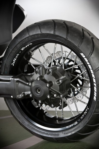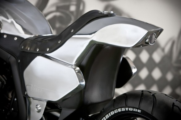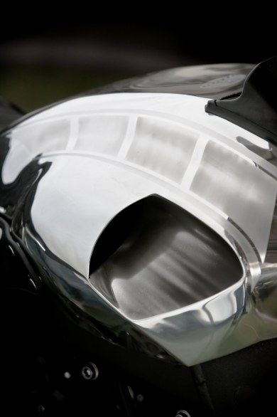 Το πρώτο πράγμα που αιχμαλωτίζει το βλέμμα είναι οι έντονες επιφάνειες από στιλβωμένο αλουμίνιο. Η αισθητική του ελαφρού μετάλλου απέχει πολύ από εκείνη του μοντέλου παραγωγής, ενώ στη διαφοροποίηση συμβάλουν οι δύο οβάλ αγωνιστικές πινακίδες στα πίσω καπάκια της μοτοσυκλέτας.