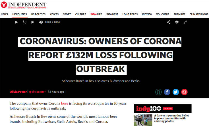 Επιπλέον όταν ξεκίνησε να εξαπλώνεται ο φονικός ιός, υπήρχαν δημοσιεύματα που ήθελαν πλήθος κόσμου να μην αγοράζει τη μπύρα Corona γιατί πίστευε ότι θα κολλήσει κορονοϊό.