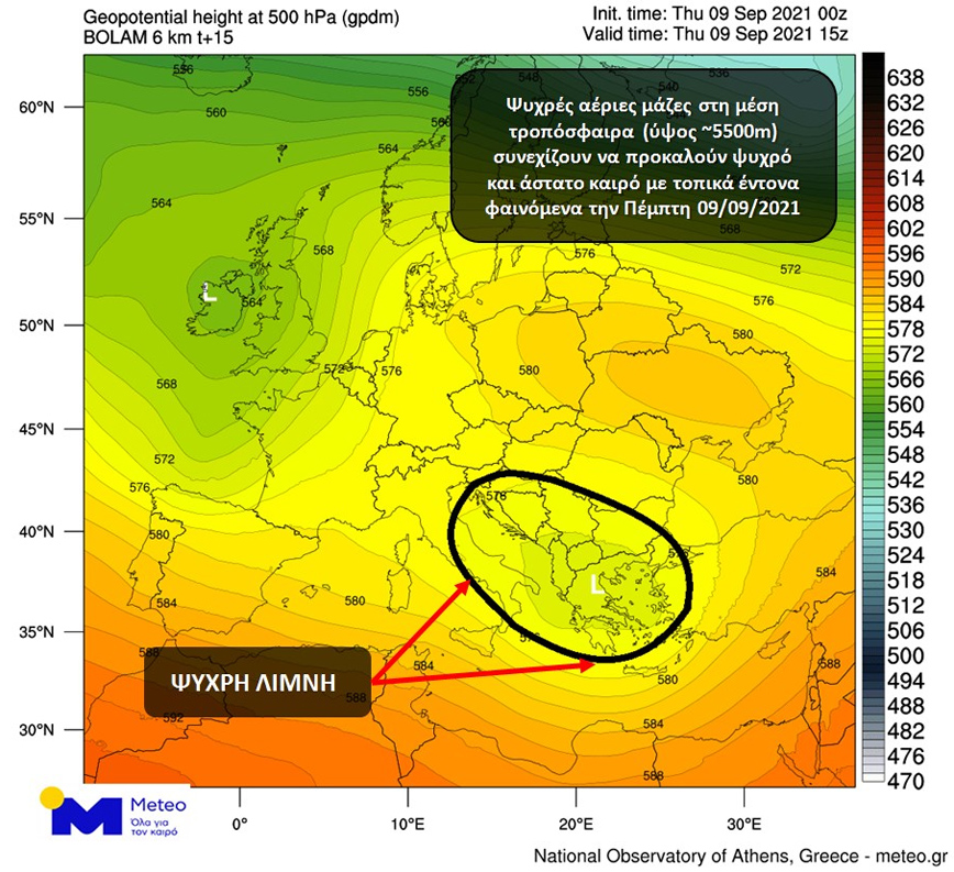 Οι ψυχρές αέριες μάζες στη μέση τροπόσφαιρα, που με τη μορφή ψυχρής λίμνης εντοπίζονται πάνω από την Ελλάδα και την Ιταλία, αναμένεται να συνεχίσουν να επηρεάζουν τον καιρό της χώρας μας την Πέμπτη 9 Σεπτεμβρίου, σύμφωνα με τα προγνωστικά στοιχεία του Εθνικού Αστεροσκοπείου Αθηνών/meteo.gr.