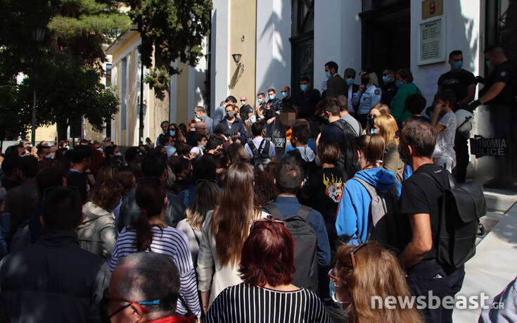 Μπροστά στο κτίριο 9 στα Δικαστήρια της Σχολής Ευελπίδων εξελίχθηκε συγκέντρωση διαμαρτυρίας και οι συγκεντρωμένοι ξέσπασαν σε χειροκροτήματα τη στιγμή που ο 14χρονος Βαγγέλης αφέθηκε ελεύθερος με τη συνοδεία της μητέρας του.