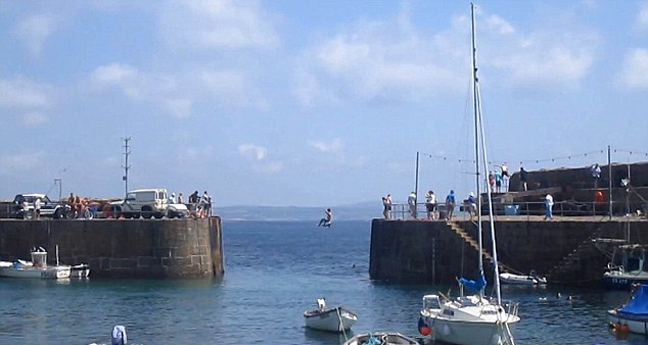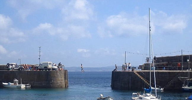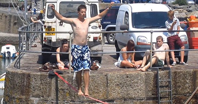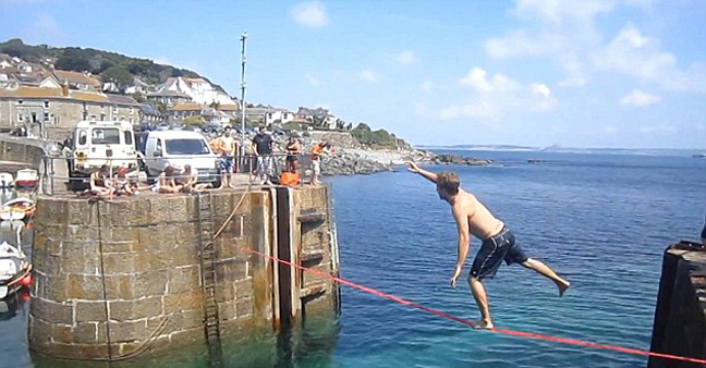 Οι κυνηγοί της αδρεναλίνης έχουν βρει νέο «χόμπι» στη Βρετανία: επιχειρούν να βαδίσουν πάνω σε τεντωμένο σκοινί μήκους 15 μέτρων, στην είσοδο του λιμανιού του χωριού Mousehole στην Κορνουάλη.