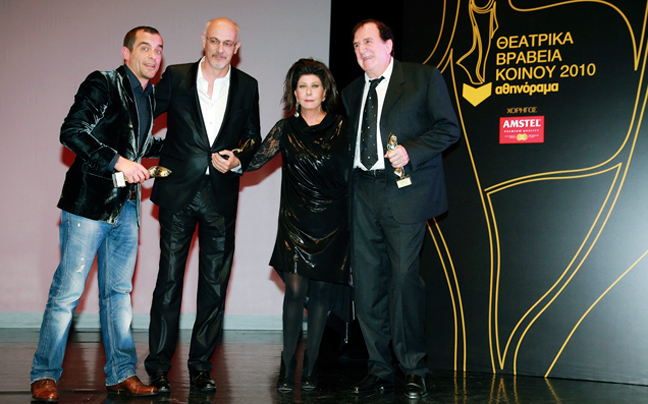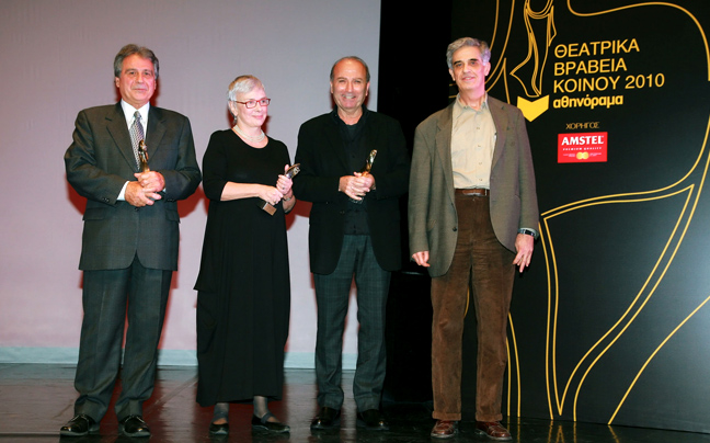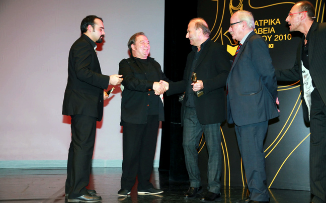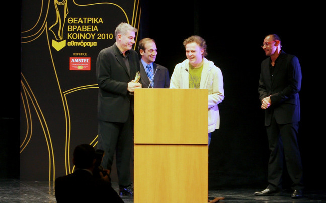 ΒΡΑΒΕΙΟ ΠΑΡΑΣΤΑΣΗΣ: Ο Λευτέρης Βογιατζής παραδίδει τα βραβεία στην Ξένια Καλογεροπούλου (Μέλος του Δ.Σ. του Εθνικού Θεάτρου), στον Κάρολο Παυλάκη και στον Θεόδωρο Τερζόπουλο.