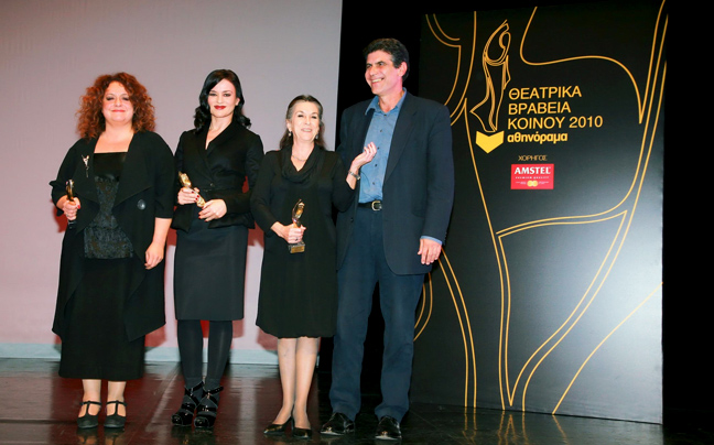 Ο Γιάννης Μπέζος με τις τρεις βραβευμένες στο γυναικείο ρόλο. Η Ελένη Κοκκίδου, η Καρυοφυλλιά Καραμπέτη και η Νένα Μεντή.