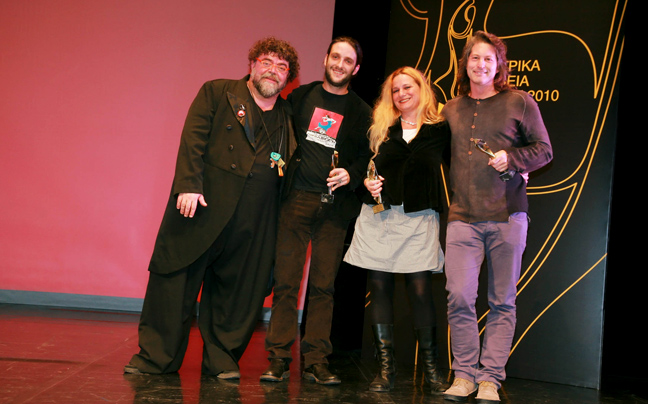 Ο Διαγόρας Χρονόπουλος παραδίδει το Βραβείο Σκηνοθεσίας. Ο Αργύρης Ξάφης που παραλαμβάνει το βραβείο του Θωμά Μοσχόπουλου, ο Σταμάτης Φασουλής και ο Θεόδωρος Τερζόπουλος.