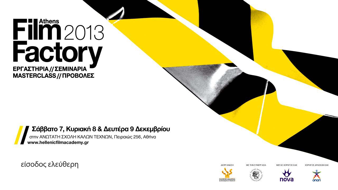 Η Ελληνική Ακαδημία Κινηματογράφου (ΕΑΚ), σε συνεργασία με το Θεάτρο της Ανωτάτης Σχολής Καλών Τεχνών και την υποστήριξη της Α.Σ.Κ.Τ., διοργανώνουν για δεύτερη συνεχή χρονιά το εκπαιδευτικό τριήμερο Film Factory, στις 7, 8 & 9 Δεκεμβρίου 2013, στην ΑΣΚΤ (Πειραιώς 256).