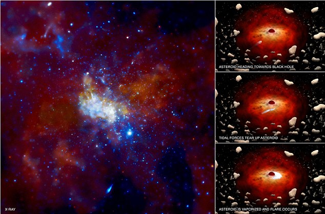 Κάθε μέρα φαίνεται πως «καταβροχθίζει» αστεροειδείς και κομήτες η γιγάντια αόρατη μαύρη τρύπα που, που βρίσκεται στο κέντρο του γαλαξία μας. Έτσι, εξηγούνται και οι συχνές συχνές εκλάμψεις, τις οποίες παρατηρούν οι αστρονόμοι στην περιοχή αυτή. Στο συμπέρασμα αυτό κατέληξαν οι επιστήμονες που ανέλυσαν τα στοιχεία του διαστημικού τηλεσκοπίου ακτίνων-Χ «Τσάντρα» της NASA.