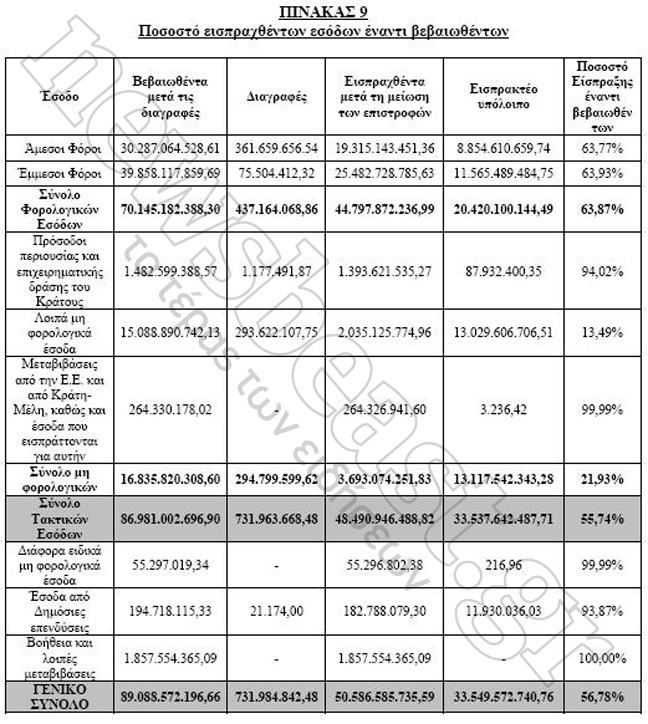 Ιδιαιτέρα ενδιαφέρον είναι το γεγονός ότι ενώ οι εφορίες είχαν βεβαιώσει έσοδα 89 δισ. ευρώ το 2009 εισπράχτηκαν τελικά 50,5 δισ. και μετά από την αφαίρεση των φόρων που επεστράφησαν κατέληξαν μόνο 33,5 δισ. στα κρατικά ταμεία δηλαδή ποσοστό 56,78%. Τα υπόλοιπα 38,5 δισ. είναι σε εκκρεμότητα!