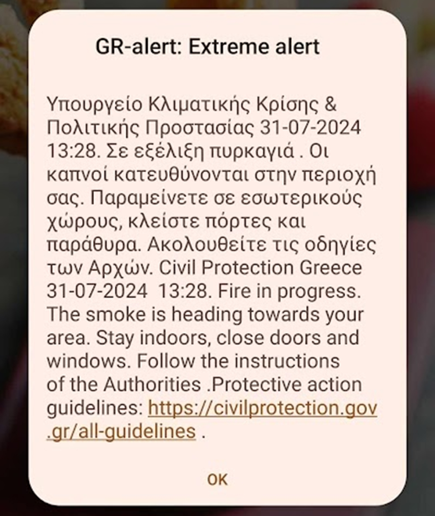«Υπουργείο Κλιματικής Κρίσης & Πολιτικής Προστασίας 31-07-2024 13:36. Σε εξέλιξη πυρκαγιά σε αποθήκη στο Αιγάλεω Αττικής. Οι καπνοί κατευθύνονται στην περιοχή σας. Παραμείνετε σε εσωτερικούς χώρους, κλείστε πόρτες και παράθυρα. Ακολουθείτε τις οδηγίες των Αρχών».