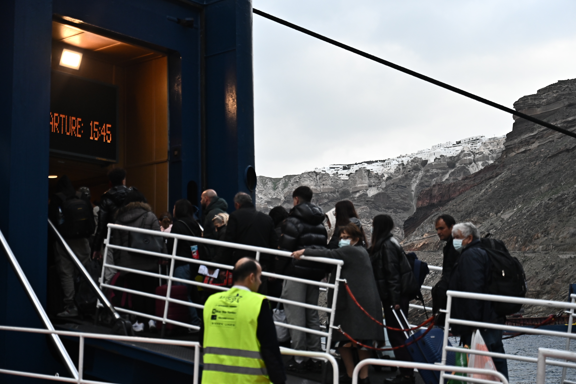 Κάτοικοι και επισκέπτες της Σαντορίνης σχηματίζουν ουρές στο λιμάνι του νησιού, στην προσπάθειά τους να το εγκαταλείψουν προσωρινά, υπό τον φόβο νέων ισχυρότερων σεισμών.