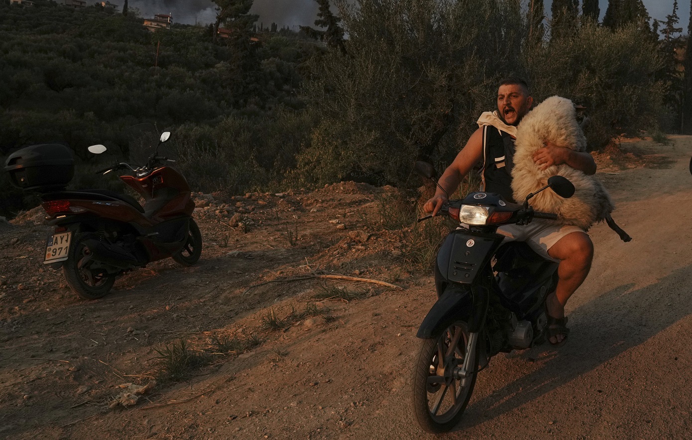 Μια εικόνα που αποτυπώνει όλη την ανθρώπινη διάσταση της καταστροφής κατέγραψε ο φωτογραφικός φακός του Associated Press, εν μέσω των πύρινων μετώπων που κατακαίνε την Αχαΐα. Σε έναν χωματόδρομο τυλιγμένο από καπνούς και φωτιά, ένας νεαρός άνδρας οδηγεί το μηχανάκι του, κρατώντας στην αγκαλιά του ένα πρόβατο, προσπαθώντας απεγνωσμένα να σώσει.