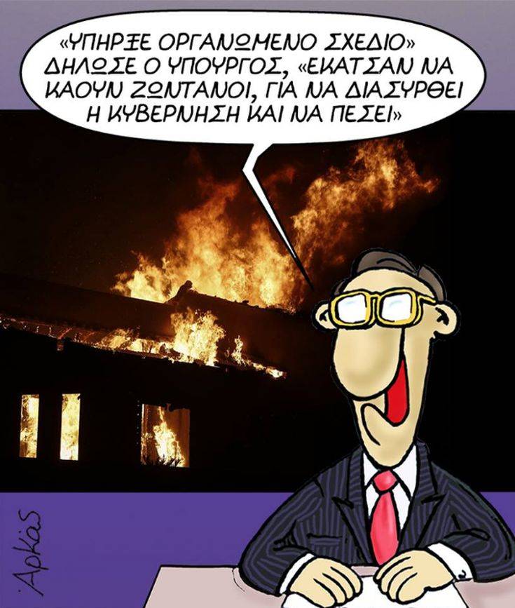 Με δύο από τα γνώριμα πια σκίτσα του, ο Αρκάς καυτηριάζει την κυβερνητική στάση όσον αφορά στις ευθύνες για τις καταστροφικές πυρκαγιές στην Αττική, και ιδιαίτερα την πολιτική ευθύνη που ανέλαβε ο πρωθυπουργός Αλέξης Τσίπρας. Δείτε τα σκίτσα του Αρκά που δημοσιεύτηκαν στην επίσημη σελίδα του στο Facebook: