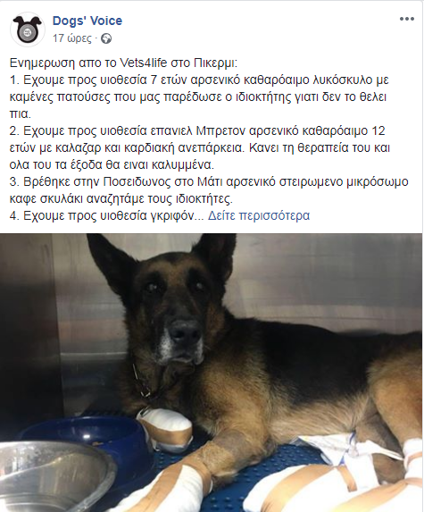 Οι ιστορίες με τα ζώα που έρχονται στο φως της δημοσιότητας από τις φωτιές στην Αττική και στο Μάτι συνεχίζουν να προκαλούν το ενδιαφέρον. Μόλις χθες ήρθε στο φως της δημοσιότητας η υπόθεση με ένα λυκόσκυλο που βρισκόταν στο Μάτι. Το άτυχο ζώο έχει καμένες πατούσες από την φωτιά. Όπως αναφέρει η MKO «Dogs Voice»: «Έχουμε προς υιοθεσία 7 ετών αρσενικό καθαρόαιμο λυκόσκυλο με καμένες πατούσες που μας παρέδωσε ο ιδιοκτήτης γιατί δεν το θέλει πια».