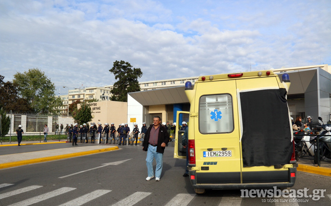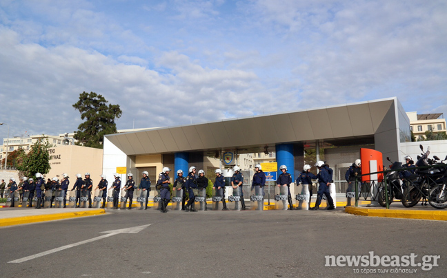 Έξω από το υπουργείο και για λόγους ασφαλείας βρίσκονται αστυνομικές δυνάμεις των ΜΑΤ.