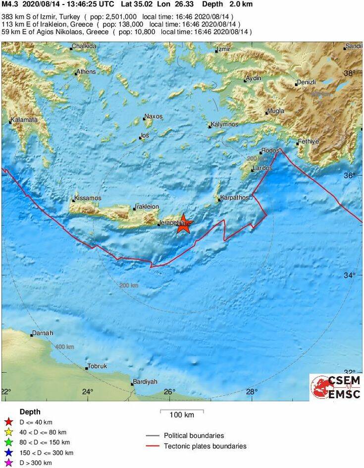 Σεισμός ταρακούνησε πριν από λίγο την Κρήτη. Η δόνηση σύμφωνα με το Ευρωμεσογειακό είχε μέγεθος 4,2 βαθμούς της κλίμακας Ρίχτερ και το επίκεντρό της εντοπίζεται στα ανατολικά της Ιεράπετρας και 52 χλμ. ανατολικά του Αγίου Νικολάου.