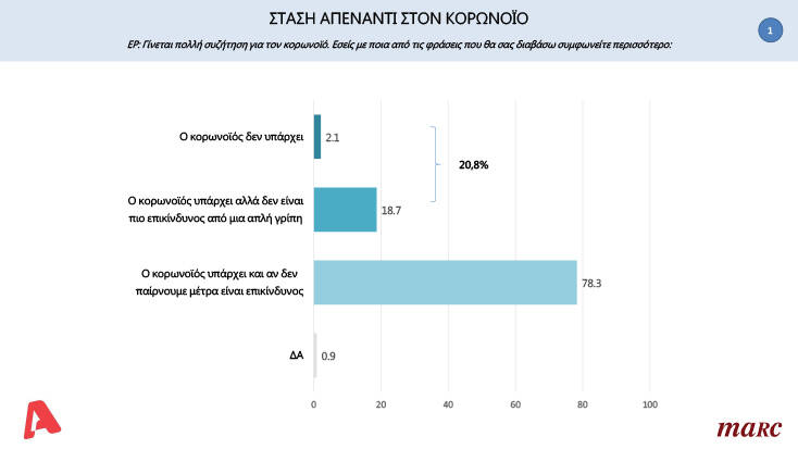 Από την άλλη πλευρά, το 20,8% των ερωτηθέντων πιστεύουν πως ο κορονοϊός ή δεν υπάρχει ή υπάρχει αλλά δεν είναι πιο επικίνδυνος από μια απλή γρίπη.