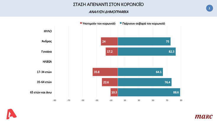 Όσον αφορά το δημογραφικό χάρτη της συγκεκριμένης ερώτησης, το 24% όσων υποτιμούν τον κορονοϊό είναι άνδρες και 17,2% γυναίκες.
