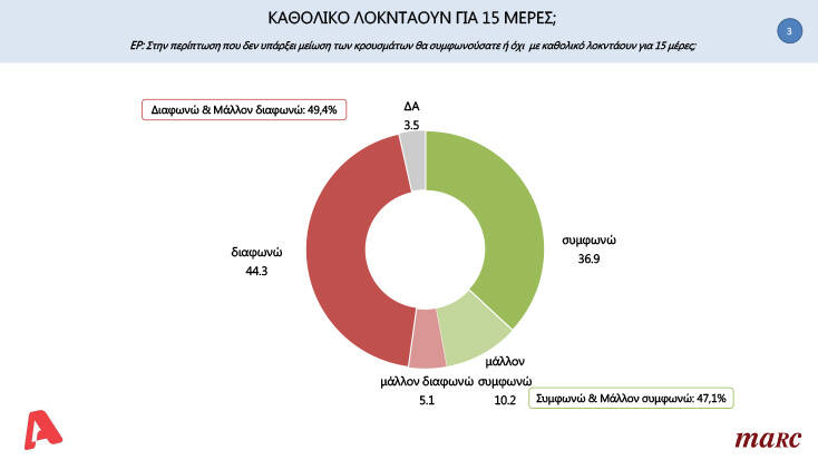 Θα πρέπει να επιβληθεί καθολικό lockdown για 15 μέρες ώστε να μειωθούν τα κρούσματα κορονοϊού στη χώρα. Εδώ τα ευρήματα είναι μοιρασμένα αφού το 36,9% απάντησαν πως συμφωνούν με μια τέτοια σκέψη και 44,3% πως διαφωνούν.