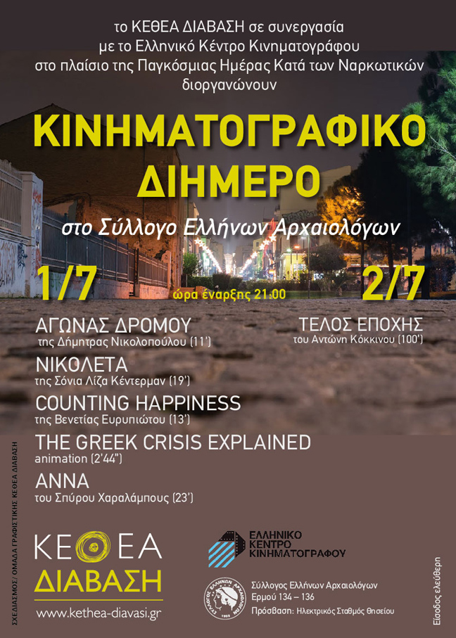Το Θεραπευτικό Πρόγραμμα Απεξάρτησης ΚΕΘΕΑ ΔΙΑΒΑΣΗ και το Ελληνικό Κέντρο Κινηματογράφου, στο πλαίσιο της Παγκόσμιας Ημέρας Κατά των Ναρκωτικών, συνδιοργανώνουν διήμερο κινηματογραφικών προβολών στη 1 και στις 2 Ιουλίου 2014 στο χώρο του Συλλόγου Ελλήνων Αρχαιολόγων.