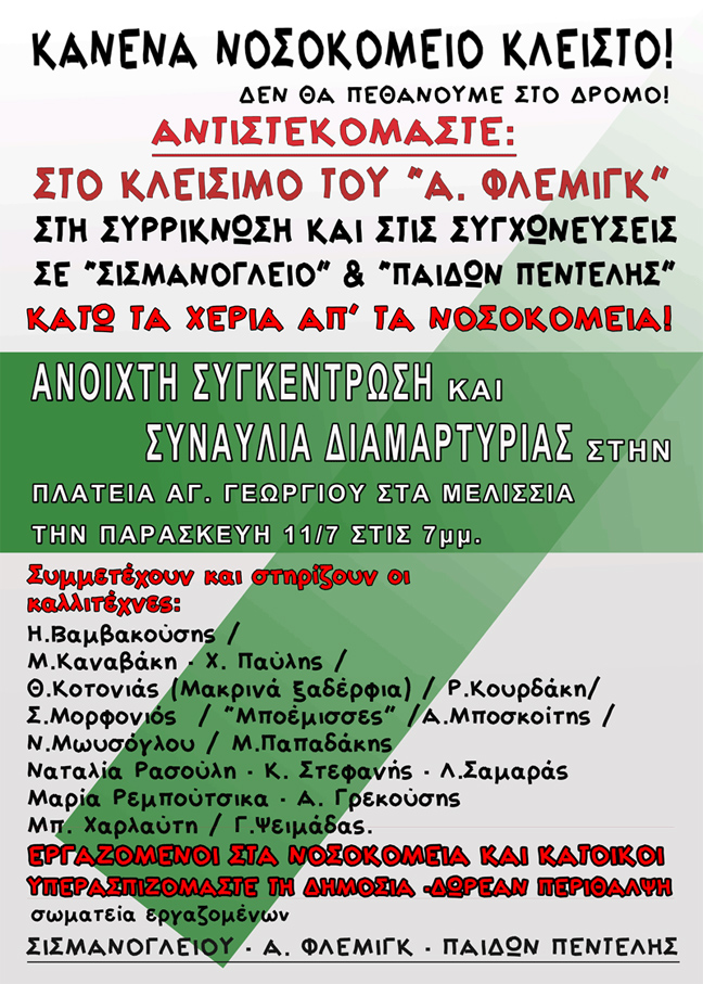 Συγκέντρωση και συναυλία διαμαρτυρίας ενάντια στο κλείσιμο του «Αμαλία Φλέμινγκ», τη συρρίκνωση και τις συγχωνεύσεις του «Σισμανόγλειου» και του Παίδων Πεντέλης διοργανώνουν το απόγευμα της Παρασκευής, στις 19:00, στην πλατεία Αγ. Γεωργίου στα Μελίσσια τα σωματεία των τριών νοσοκομείων.