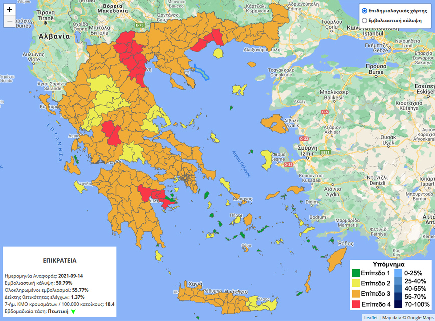 Σύμφωνα με τον επιδημιολογικό χάρτη από τις 7 παραπάνω περιοχές της χώρας, μόνο η Αργολίδα και η Ευρυτανία παραμένουν στο κόκκινο χρώμα, κάτι που σημαίνει ότι Αχαΐα, Ηλεία, Μεσσηνία, Ηράκλειο και Ικαρία θα δουν χαλάρωση των μέτρων.