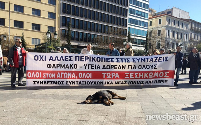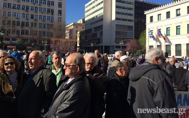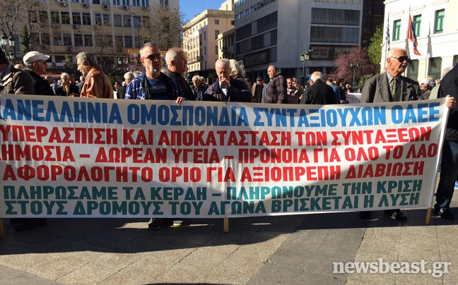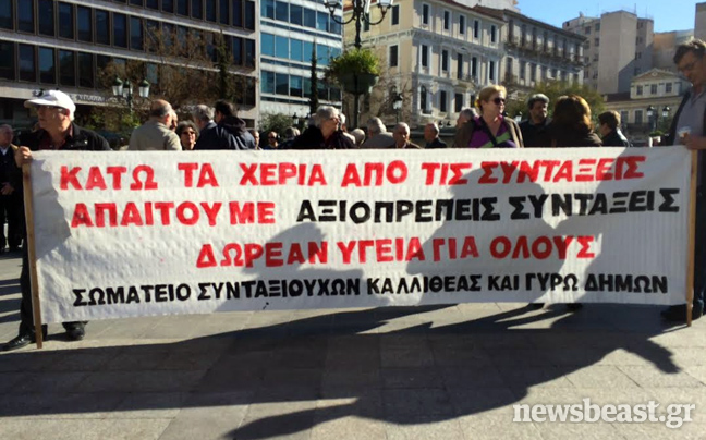 Με συνθήματα ενάντια στις περικοπές στις συντάξεις και τον τομέα της Υγείας και στη ρήτρα μηδενικού ελλείμματος ξεκίνησε η συγκέντρωση των συνταξιούχων στην πλατεία Κοτζιά.