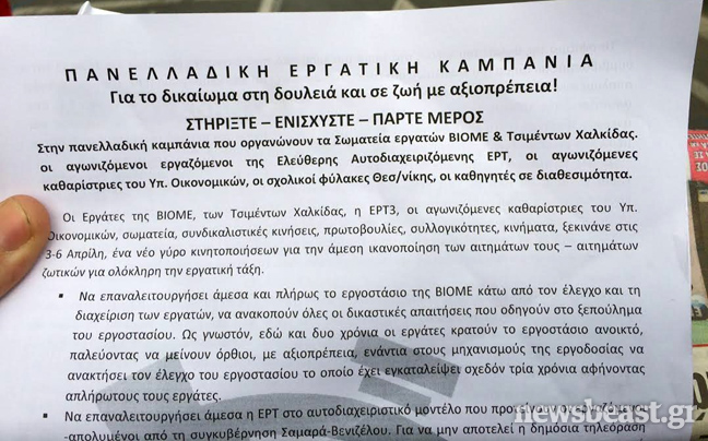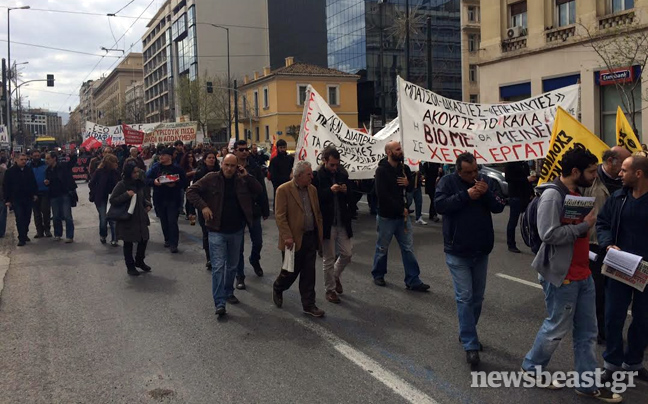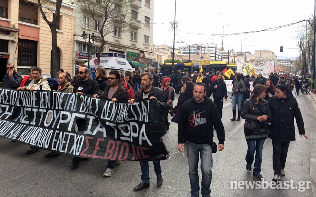 Πρόκειται για πορεία που διοργάνωσαν τα Σωματεία εργατών ΒΙΟΜΕ και Τσιμέντων Χαλκίδας, οι αγωνιζόμενοι εργαζόμενοι της Ελεύθερης Αυτοδιαχειριζόμενης ΕΡΤ, οι καθαρίστριες του υπουργείου Οικονομικών, οι σχολικοί φύλακες Θεσσαλονίκης και οι καθηγητές σε διαθεσιμότητα.