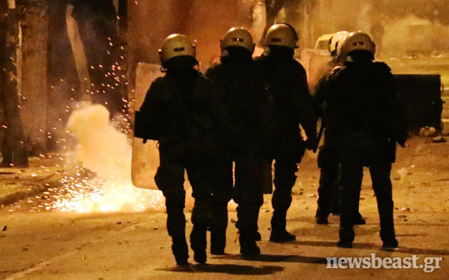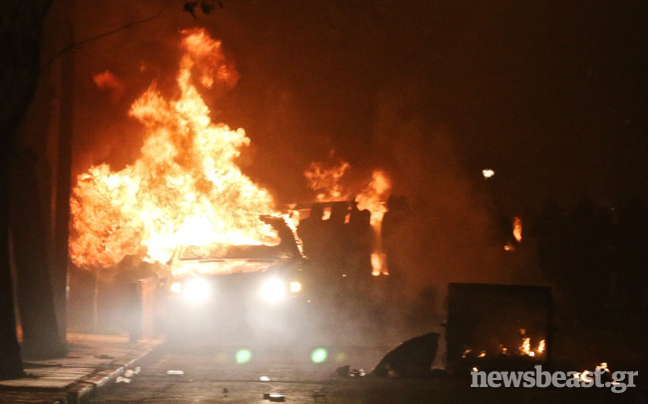 Τουλάχιστον δύο αυτοκίνητα παραδόθηκαν στις φλόγες, ενώ οι νεαροί πραγματοποιούσαν αλλεπάλληλες εξόδους πετώντας φωτοβολίδες, μολότοφ και άλλα αντικείμενα κατά των αστυνομικών για πέντε περίπου ώρες. Οι αστυνομικές δυνάμεις απάντησαν με χειροβομβίδες κρότου – λάμψης.
