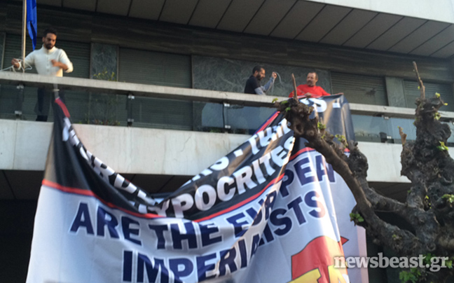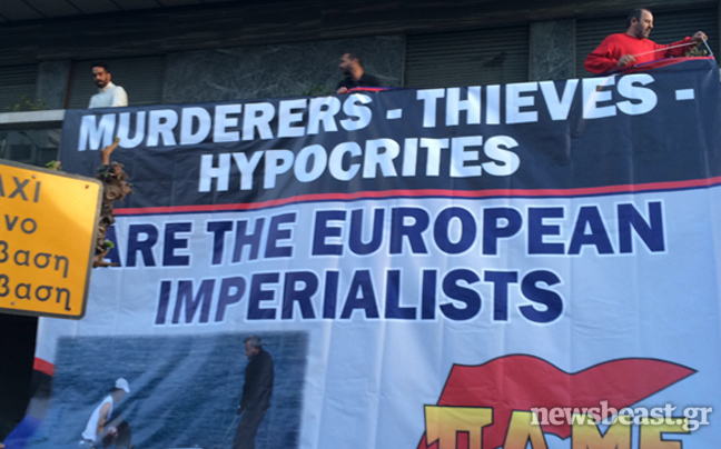 Οι διαδηλωτές κρέμασαν αρχικά ένα πανό από το μπαλκόνι το οποίο έγραφε στα αγγλικά « Φονιάδες Ληστές Υποκριτές είναι οι Ευρωπαίοι ιμπεριαλιστές».