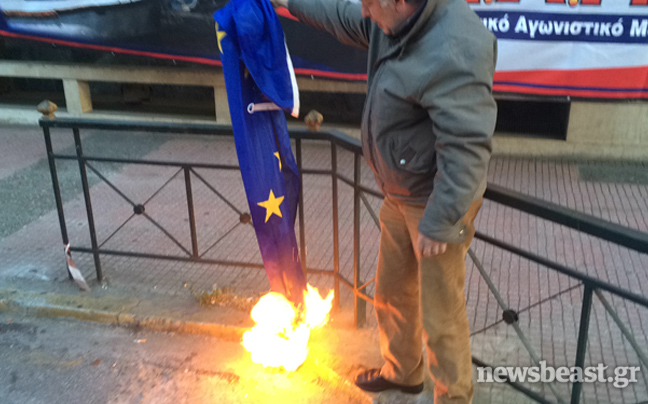 Κατόπιν, οι διαδηλωτές κατέβασαν και έκαψαν τη σημαία της ΕΕ.