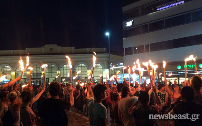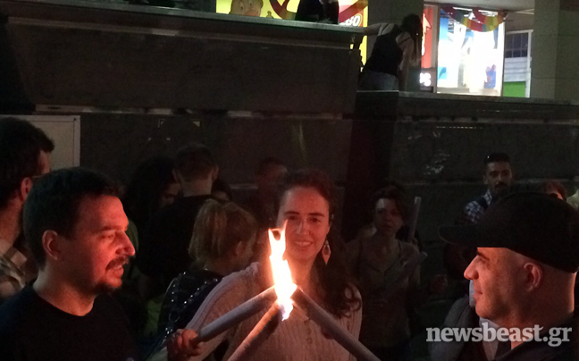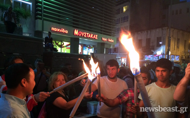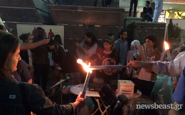 Οι συμμετέχοντες στην εκδήλωση κρατούσαν στα χέρια τους αναμμένες δάδες και σχημάτισαν με τα σώματά τους το σήμα της ειρήνης.