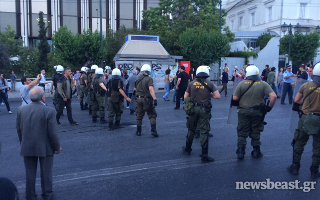Οι δύο πορείες συναντήθηκαν στη συμβολή των οδών Βασιλίσσης Σοφίας και Αμαλίας, με αποτέλεσμα να υπάρξει ένταση, που ξεκίνησε με αφορμή το ποιος θα κατευθυνθεί πρώτος προς την πρεσβεία.