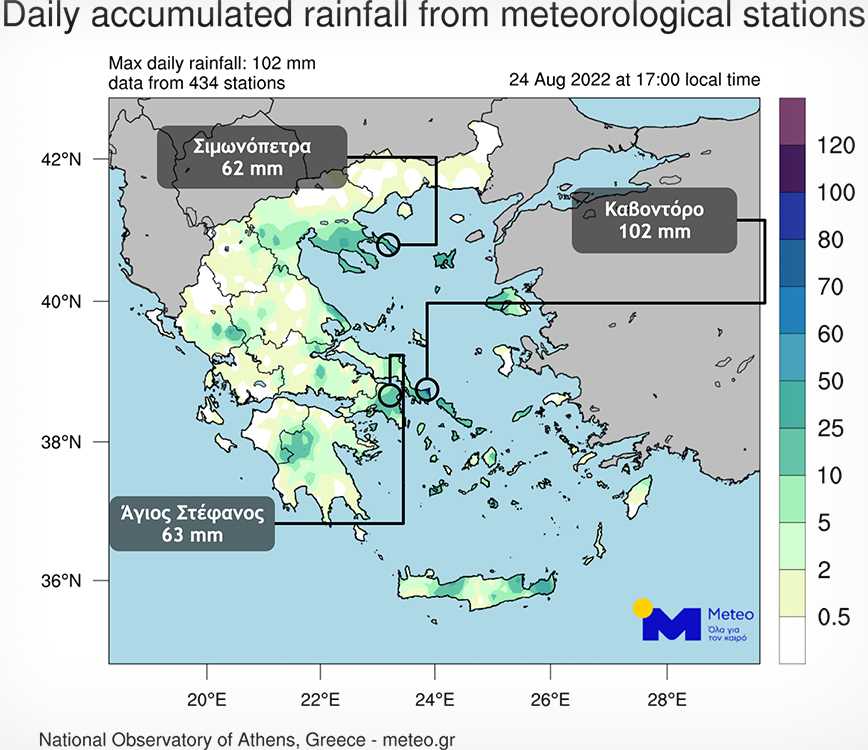 Πιο αναλυτικά, με βάση τα δεδομένα από το πυκνό δίκτυο αυτόματων μετεωρολογικών σταθμών του Εθνικού Αστεροσκοπείου Αθηνών/meteo.gr, το μεγαλύτερο ύψος βροχής ήταν ίσο με 102mm και καταγράφηκε στο μετεωρολογικό σταθμό στο Κάβοντορο.