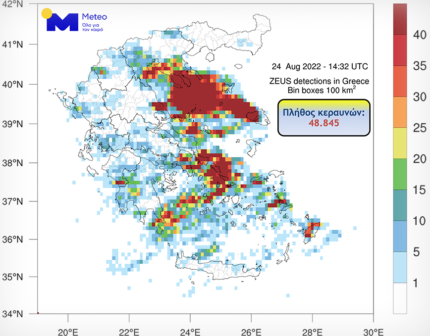 Επίσης, στην Αττική το μεγαλύτερο ύψος βροχής καταγράφηκε στο μετεωρολογικό σταθμό στον Άγιο Στέφανο και ήταν ίσο με 63mm. Παράλληλα στην χώρα μας το σύστημα καταγραφής κεραυνών Ζεύς ανίχνευσε σχεδόν 50.000 κεραυνούς εώς τις 17:00 της Τετάρτης (24/8).