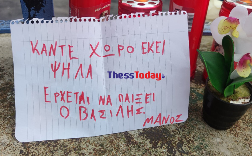 Συγκλονίζει η εικόνα του μικρού Μάνου, που την ώρα της έκρηξης έπαιζε με το άτυχο συμμαθητή του στην αυλή. Έξω από την εκκλησία κρατούσε στα χέρια του λευκά τριαντάφυλλα και ένα λευκό φύλλο χαρτιού που έγραφε : «Κάντε χώρο εκεί ψηλά έρχεται να παίξει ο Βασίλης. Μάνος».