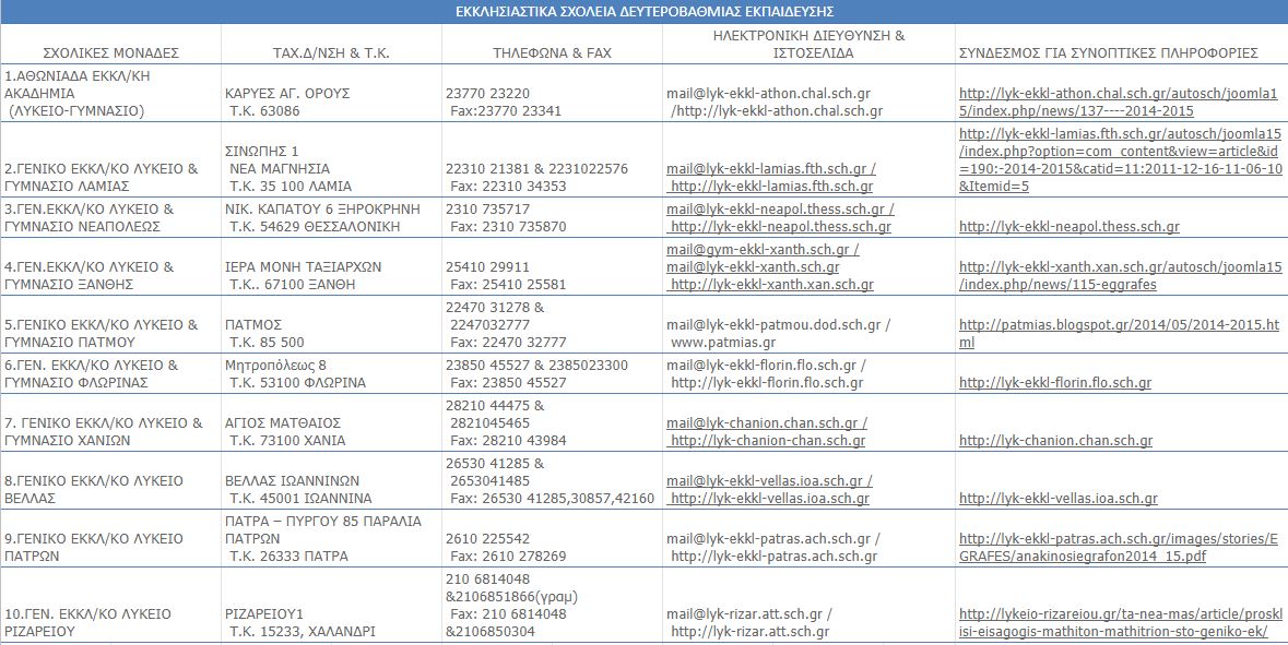 Η Διεύθυνση Εκκλησιαστικής Εκπαίδευσης και Θρησκευτικής Αγωγής του Υ.ΠΑΙ.Θ. ανακοινώνει ότι τα Εκκλησιαστικά Γυμνάσια, τα Γενικά Εκκλησιαστικά Λύκεια και τα Ιερατικά Σχολεία Δεύτερης Ευκαιρίας (ΙΣΔΕ) δέχονται εγγραφές μαθητών για το σχολικό έτος 2014-2015 έως 30 Ιουνίου 2014 (ειδικά για τη Ριζάρειο μέχρι 20/6/2014) και από 1 έως 30 Σεπτεμβρίου 2014.