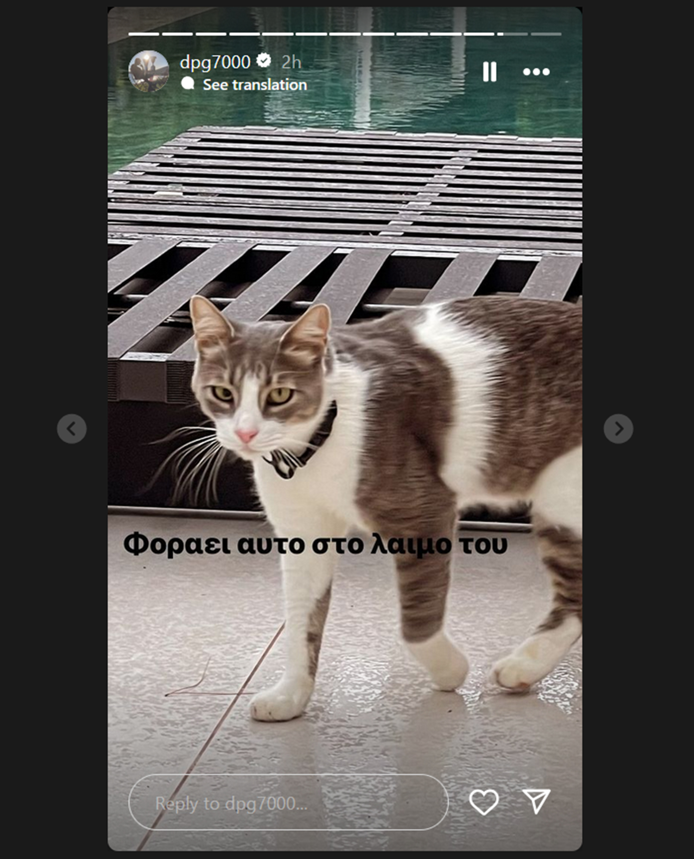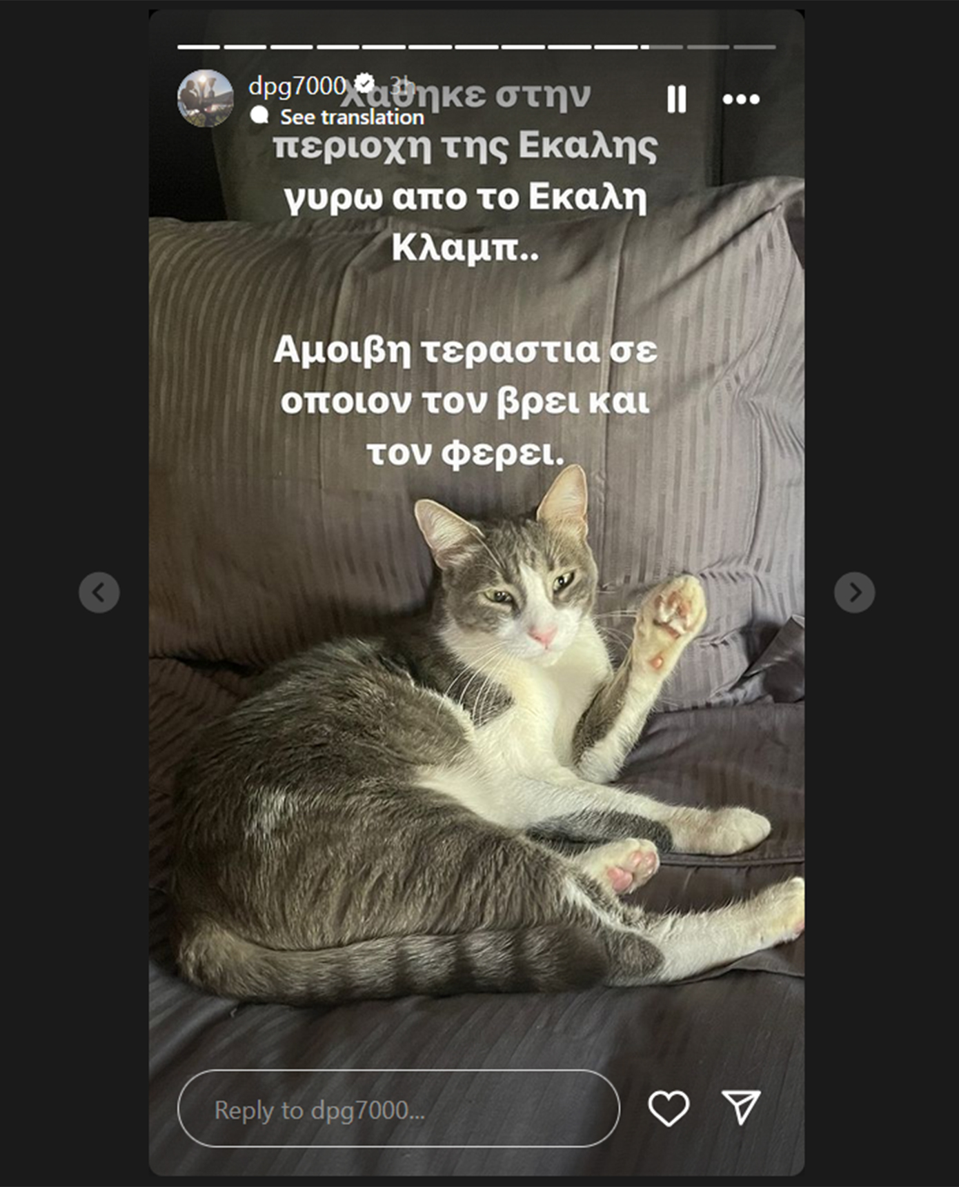 Σε story που ανέβασε αναφέρει πως χάθηκε στην περιοχή της Εκάλης, γύρω από το Εκάλη Κλαμπ και δεσμεύτηκε να δώσει τεράστια αμοιβή σε όποιον βρει τον γάτο και του τον φέρει.