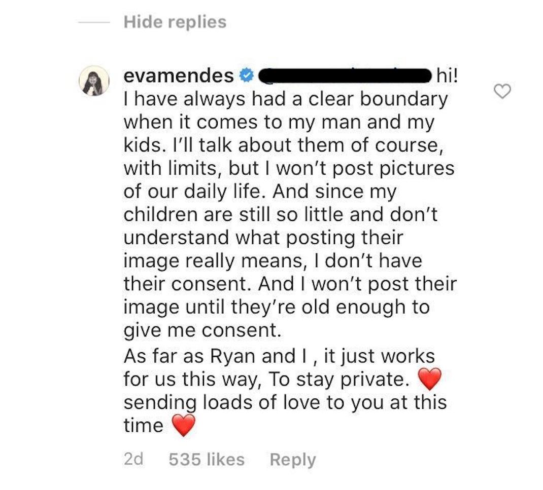 Σε ερώτηση ενός follower στο παρελθόν, γιατί δεν δημοσιεύει οικογενειακές φωτογραφίες, η Εύα Μέντες έχει απαντήσει: «Πάντα είχα ξεκάθαρα όρια όταν αφορά τον άνδρα μου και τα παιδιά μου. Μιλάω για αυτούς φυσικά, αλλά με όρια και δεν θα ποστάρω ποτέ φωτογραφίες από την καθημερινή μας ζωή. Από τη στιγμή που τα παιδιά μου είναι τόσο μικρά και δεν καταλαβαίνουν τι ακριβώς σημαίνει να δημοσιεύσω μια φωτογραφία, δεν έχω τη συγκατάθεσή τους. Άρα, δεν θα δημοσιεύσω καμία φωτογραφία τους μέχρι να είναι αρκετά μεγάλες, ώστε να μου δώσουν την άδεια. Όσον αφορά τον Ράιαν και εμένα, δουλεύει καλύτερα για εμάς με αυτόν τον τρόπο. Να κρατάμε για εμάς την προσωπική μας ζωή. Σας στέλνουμε όλη μας την αγάπη», εξήγησε.