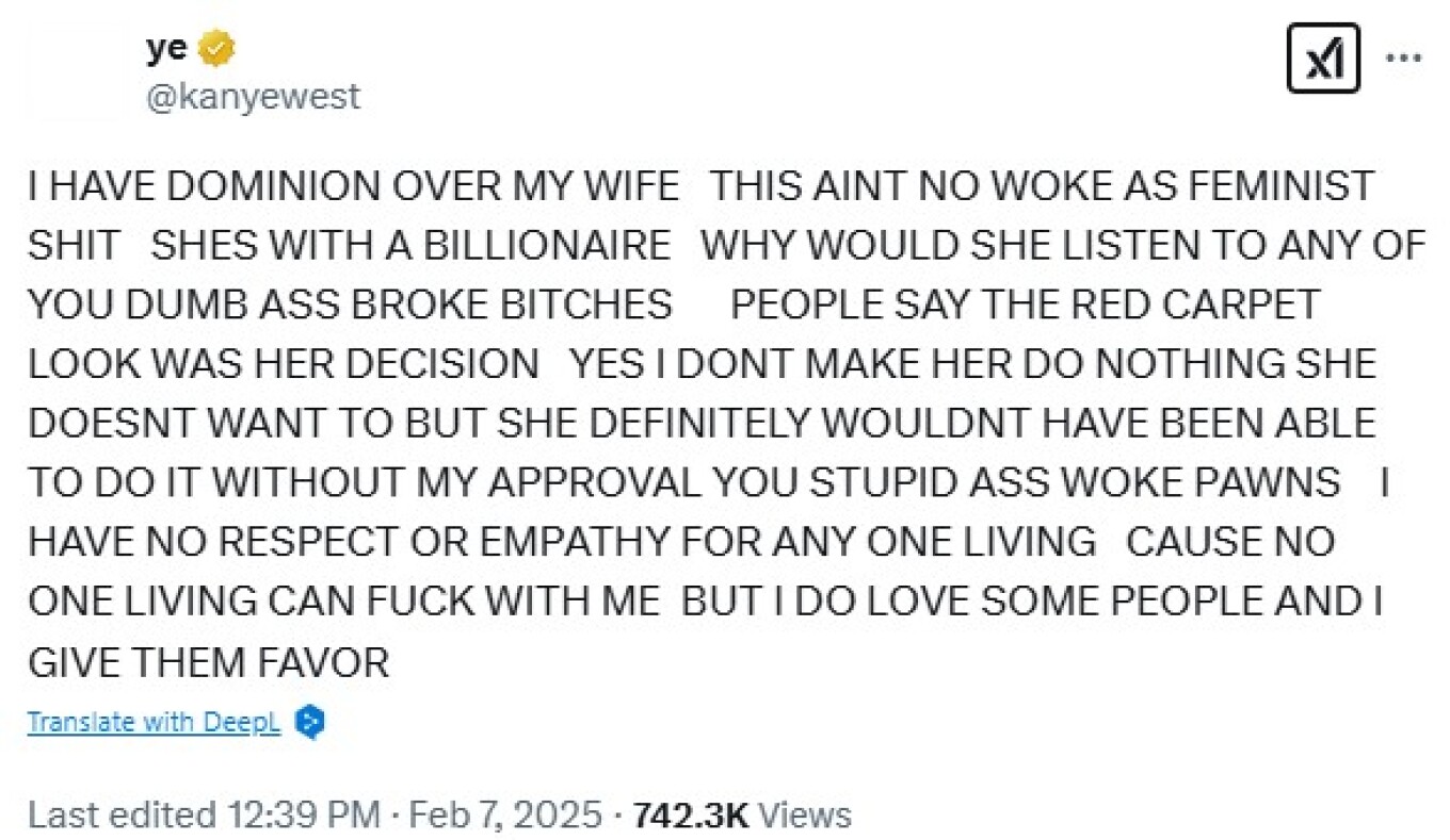 «Έχω εξουσία πάνω στη γυναίκα μου. Αυτό δεν είναι καμία woke φεμινιστική βλακεία. Είναι με έναν δισεκατομμυριούχο, γιατί να ακούσει οποιαδήποτε από εσάς τις ανόητες, άφραγκες; Λένε ότι η εμφάνιση στο κόκκινο χαλί ήταν δική της απόφαση. Ναι, δεν την αναγκάζω να κάνει κάτι που δεν θέλει, αλλά σίγουρα δεν θα μπορούσε να το κάνει χωρίς την έγκρισή μου, εσείς, βλάκες woke πιόνια. Δεν έχω κανέναν σεβασμό ή εμπάθεια για κανέναν ζωντανό, γιατί κανείς ζωντανός δεν μπορεί να τα βάλει μαζί μου. Αλλά αγαπώ κάποιους ανθρώπους και τους παρέχω τη χάρη μου».