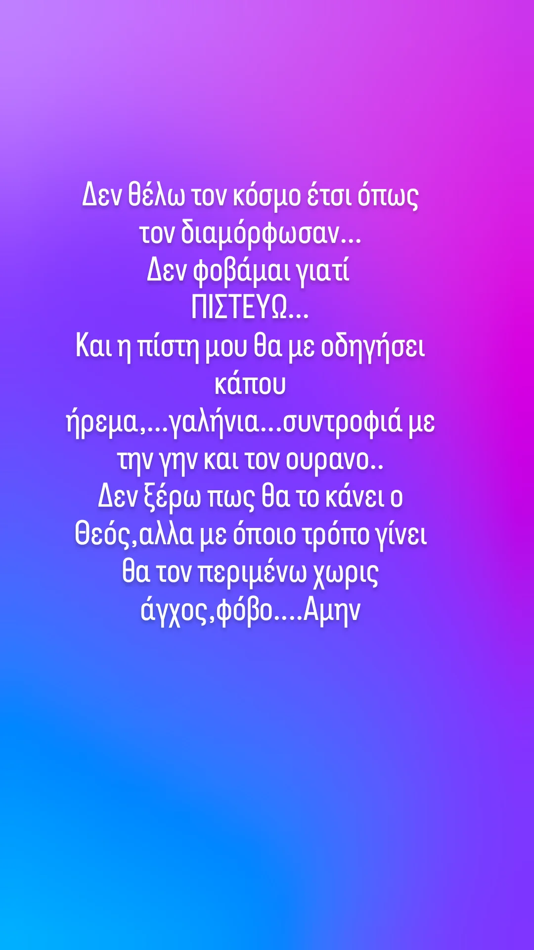 Μέσα από μια ανάρτηση εκφράζει όπως λέει την απόρριψή της προς τον κόσμο όπως έχει διαμορφωθεί, δηλώνοντας ταυτόχρονα την απόλυτη εμπιστοσύνη της στη δύναμη της πίστης.