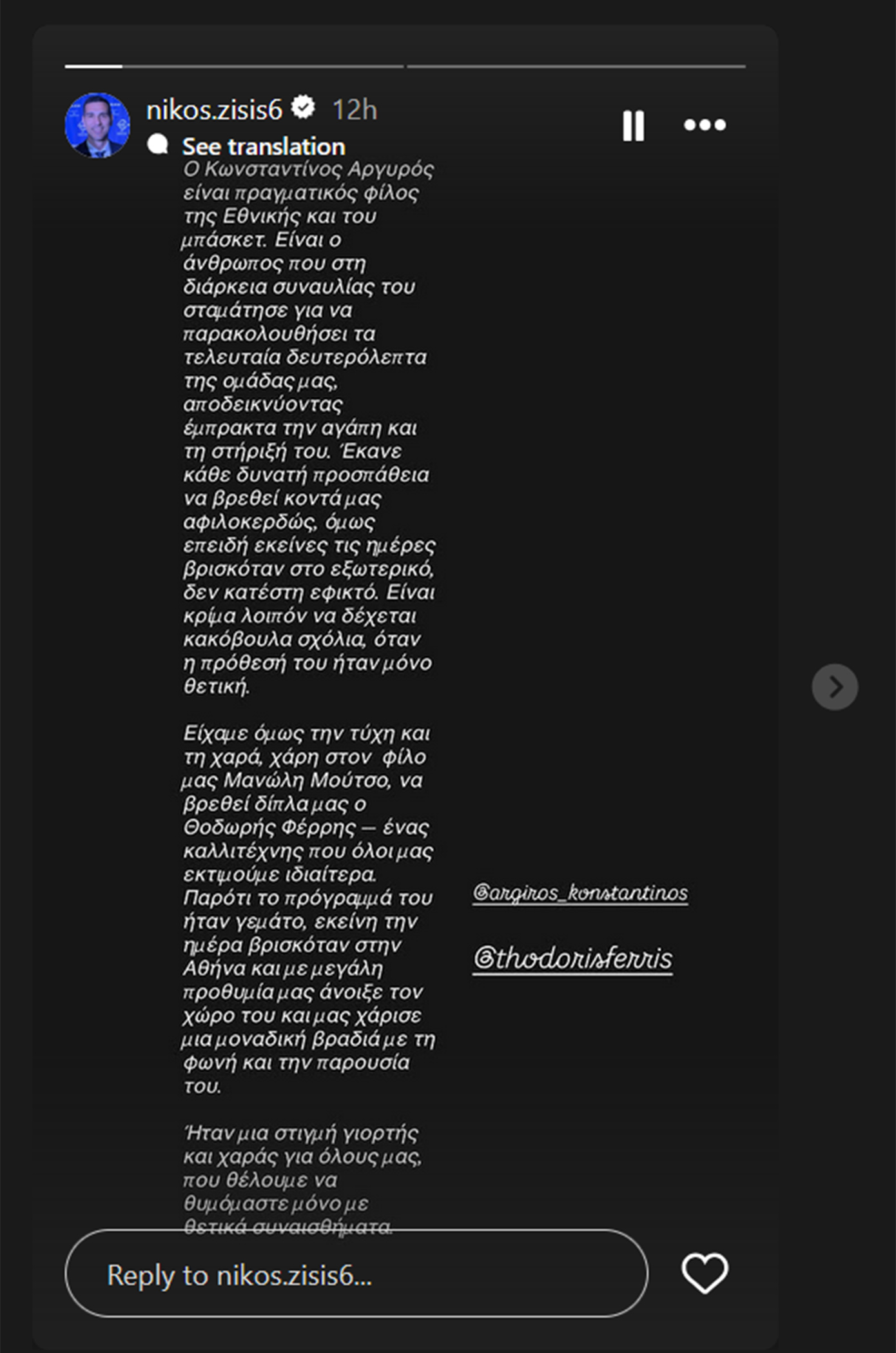 Συγκεκριμένα σημείωσε: «Ο Κωνσταντίνος Αργυρός είναι πραγματικός φίλος της Εθνικής και του μπάσκετ. Είναι ο άνθρωπος που στη διάρκεια της συναυλίας του σταμάτησε για να παρακολουθήσει τα τελευταία δευτερόλεπτα της ομάδας μας αποδεικνύοντας έμπρακτα την αγάπη και τη στήριξή του. Έκανε κάθε δυνατή προσπάθεια να βρεθεί κοντά μας αφιλοκερδώς, όμως επειδή εκείνες της ημέρες βρισκόταν στο εξωτερικό, δεν κατέστη εφικτό. Είναι κρίμα λοιπόν να δέχεται κακόβουλα σχόλια όταν η πρόθεσή του ήταν μόνο θετική. Είχαμε όμως την τύχη και τη χαρά, χάρη στον φίλο μας Μανώλη Μούτσο να βρεθεί δίπλα μας ο Θοδωρής Φέρρης – ένας καλλιτέχνης που όλοι μας εκτιμούμε ιδιαίτερα. Παρότι το πρόγραμμά του ήταν γεμάτο εκείνη την ημέρα βρισκόταν στην Αθήνα και με μεγάλη προθυμία μας άνοιξε τον χώρο του και μας χάρισε μια μοναδική βραδιά με τη φωνή και την παρουσία του. Ήταν μια στιγμή γιορτής και χαράς για όλους μας, που θέλουμε να θυμόμαστε μόνο με θετικά συναισθήματα».