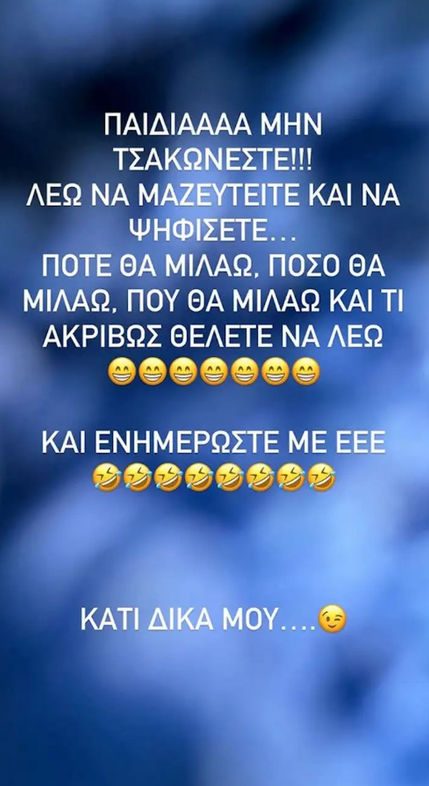 Ο Γιώργος Λιάγκας αποφάσισε να απαντήσει με ανάρτησή του: «Παιδιά μην τσακώνεστε!!! Λέω να μαζευτείτε και να ψηφίσετε…πότε θα μιλάω, πόσο θα μιλάω, πού θα μιλάω και τι ακριβώς θέλετε να λέω. Και ενημερώστε με. Κάτι δικά μου» έγραψε ο παρουσιαστής.