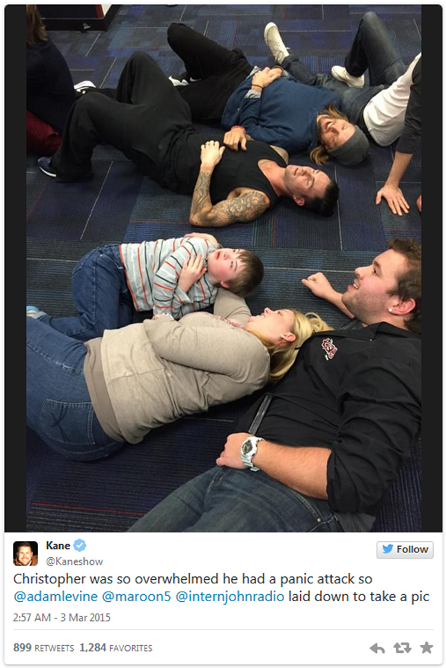 Όταν όμως ο νεαρός fan αντίκρυσε τον ήρωά του, έπαθε κρίση πανικού και για να αισθανθεί καλύτερα, ξάπλωσε στο πάτωμα. Κίνηση που μιμήθηκε και ο ποπ σταρ, ο οποίος και πρότεινε στους παρευρισκόμενους να πράξουν το ίδιο. Μάλιστα, ανέβασαν και σχετική φωτογραφία στο Twitter.