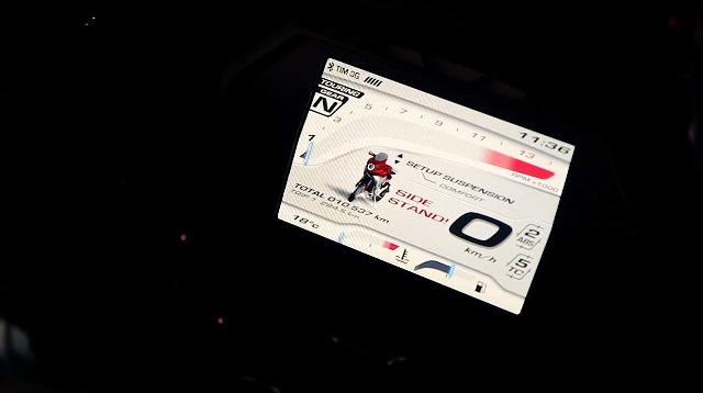 O προβολέας αποτελείται, όπως επισημαίνει και η ανάγλυφη γραφή στο ακρυλικό «κρύσταλλο», αποκλειστικά από λυχνίες LED. Η ανάρτηση είναι η ημί-ενεργητική της Sachs, ενώ στη φωτογραφία της έγχρωμης οθόνης των οργάνων διακρίνεται και το διεθνές σήμα της σύνδεσης Bluetooth, πιθανώς για χρήση του κινητού ή κάποιας άλλης συσκευής (πλοήγησης;).