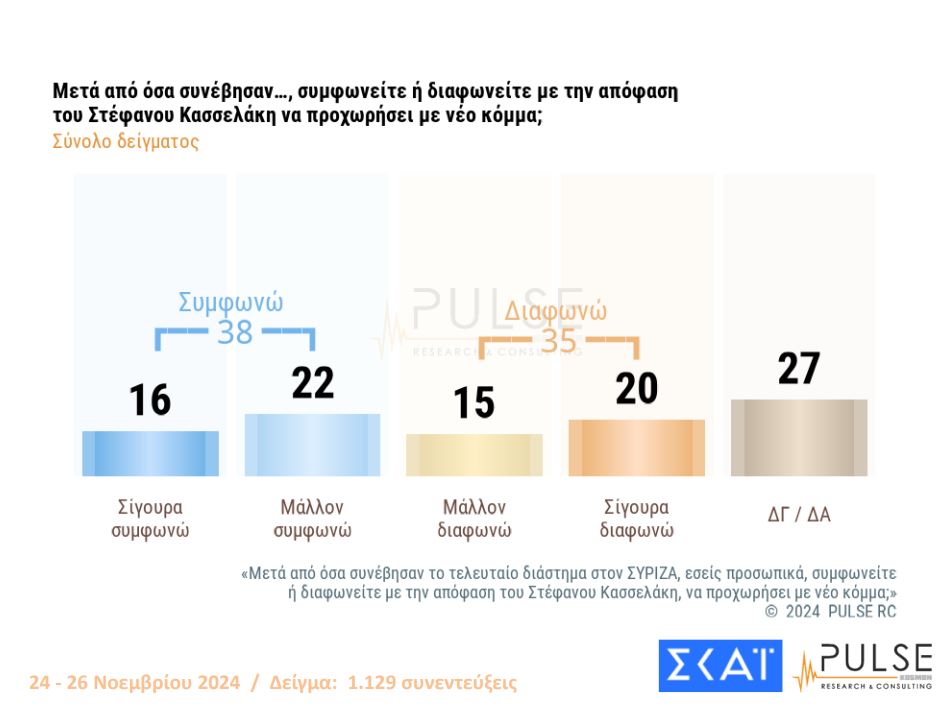 Σε ερώτημα για τη συμφωνία ή διαφωνία με την απόφαση του Στέφανου Κασσελάκη να φτιάξει νέο κόμμα, το 38% απαντά «συμφωνώ» και το 35% «διαφωνώ». Στην αντίστοιχη ερώτηση στους ψηφοφόρους του ΣΥΡΙΖΑ, το 62% λέει «συμφωνώ ή μάλλον συμφωνώ» και το 27% «διαφωνώ ή μάλλον διαφωνώ».