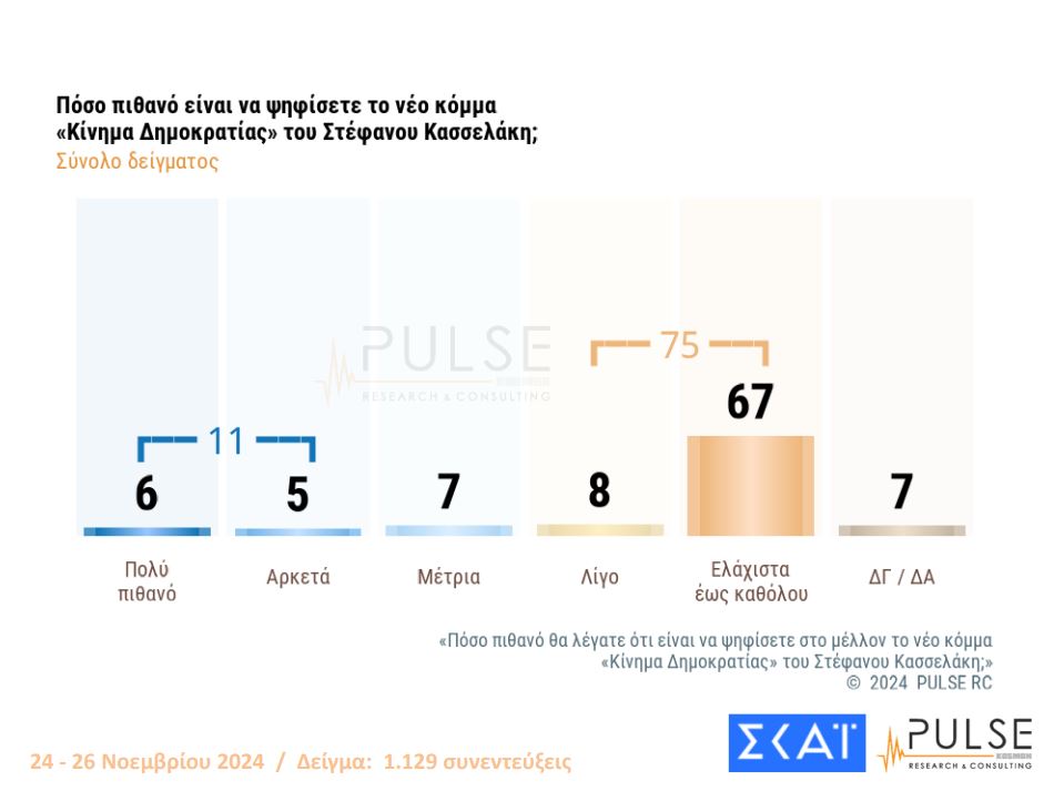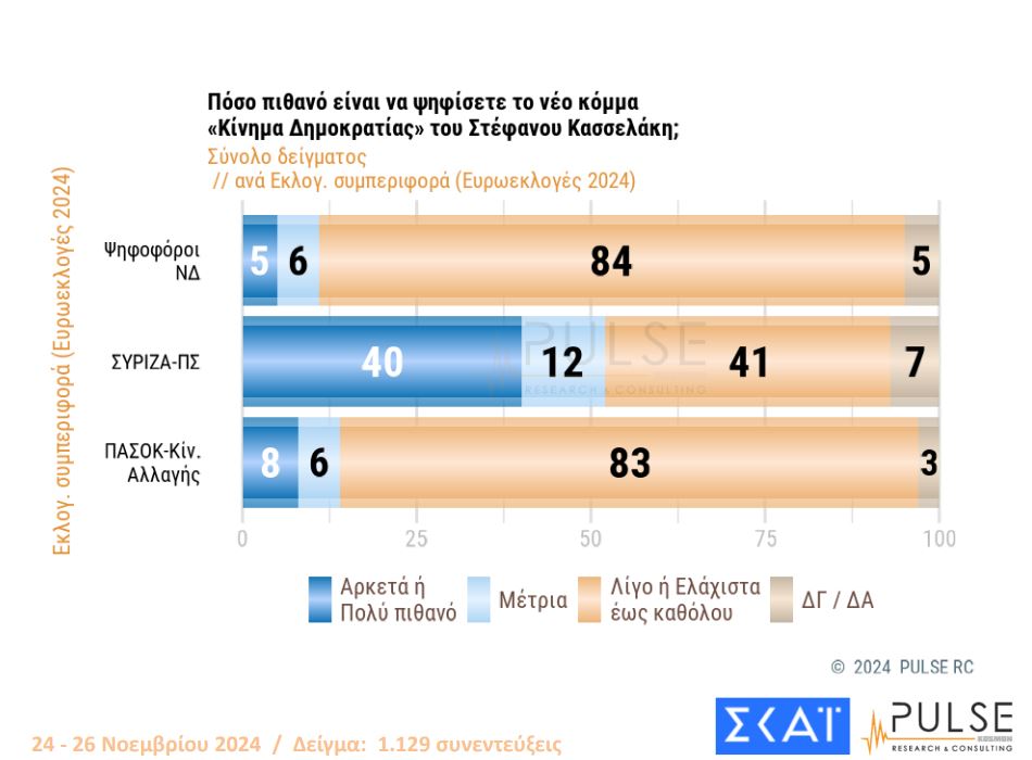 Σε ερώτηση πόσο πιθανό είναι να ψηφίσετε το κόμμα Κασσελάκη, το 11% επί του συνόλου των ψηφοφόρων δηλώνει «πολύ και αρκετά πιθανό», «μέτρια» δηλώνει το 7%, «λίγο και ελάχιστα έως καθόλου» απαντά το 75%.