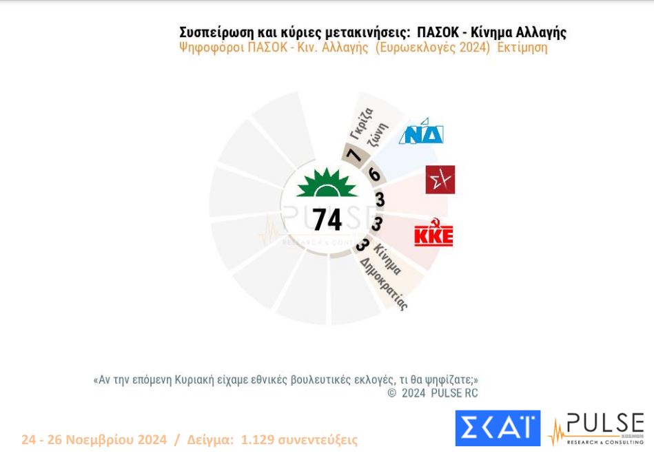 Το ΠΑΣΟΚ καταγράφει συσπείρωση 74%, χάνοντας 7% προς την «γκρίζα ζώνη», προς τη Νέα Δημοκρατία 6%, προς τον ΣΥΡΙΖΑ 3%, προς το ΚΚΕ 3% και προς το Κίνημα Δημοκρατίας 3%.