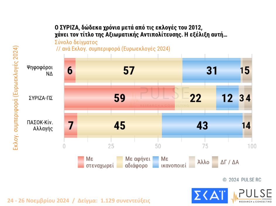 Όταν η ίδια ερώτηση γίνεται σε ψηφοφόρους του ΣΥΡΙΖΑ, εκείνοι σε ποσοστό 59% δηλώνουν πως τους στενοχωρεί, 22% πως τους αφήνει αδιάφορους και 12% πως… τους ικανοποιεί!