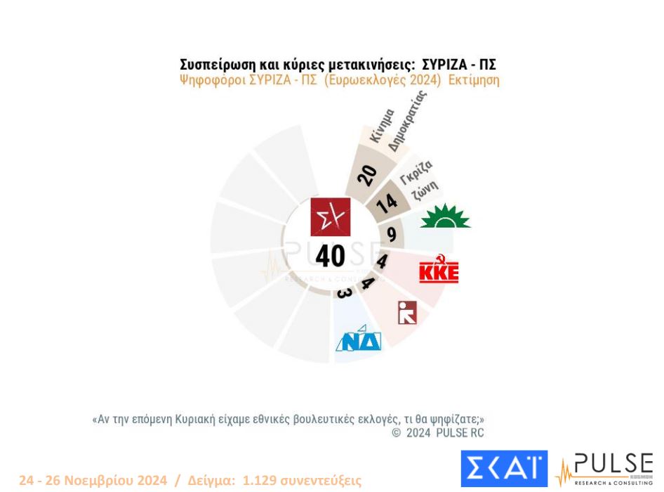 Ο ΣΥΡΙΖΑ βρίσκεται στο 40% της συσπείρωσης, χάνοντας το 20% της δύναμής του προς το Κίνημα Δημοκρατίας του Στέφανου Κασσελάκη, 14% προς την «γκρίζα ζώνη», προς το ΠΑΣΟΚ 9%, προς το ΚΚΕ 4%, προς τη Νέα Αριστερά 4% και προς τη Νέα Δημοκρατία 3%.