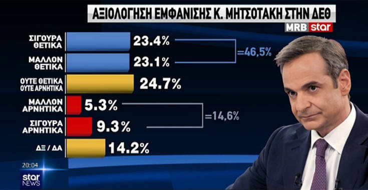 Το 46,5 % κρίνει θετικά (σίγουρα ή μάλλον) την εμφάνιση του πρωθυπουργού στη ΔΕΘ έναντι 14,6% που την κρίνει αρνητικά (σίγουρα ή μάλλον).