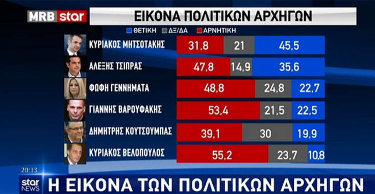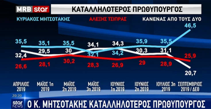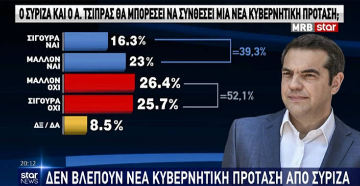 Μία νέα δημοσκόπηση παρουσίασε η MRB για λογαριασμό του STAR στο κεντρικό δελτίο ειδήσεων του σταθμού. Η έρευνα είναι η πρώτη που πραγματοποιείται μετά τις εκλογές και τη Διεθνή Έκθεση Θεσσαλονίκης (ΔΕΘ).